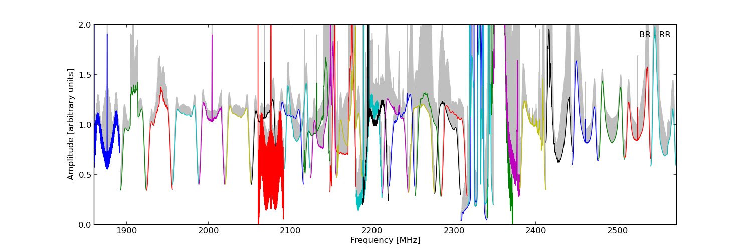Total power spectrum in arbitrary units. The solid lines indicate the mean value and the shaded area the peaks.