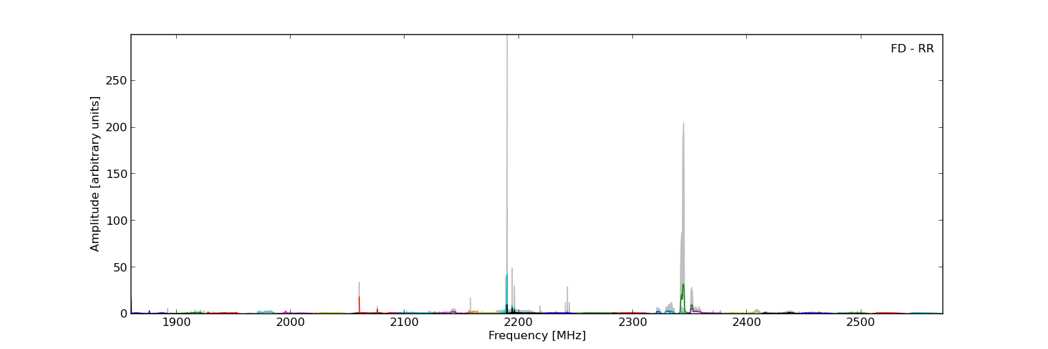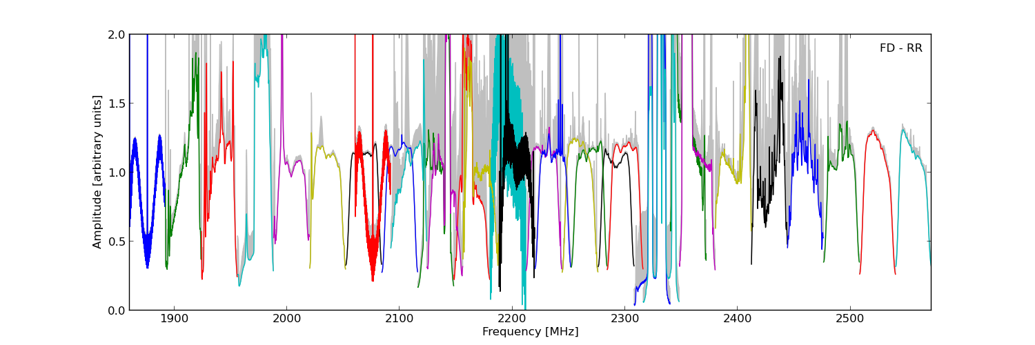 Total power spectrum in arbitrary units. The solid lines indicate the mean value and the shaded area the peaks.