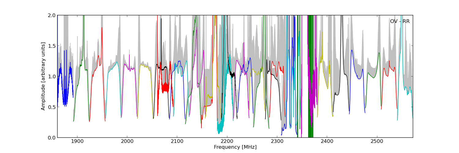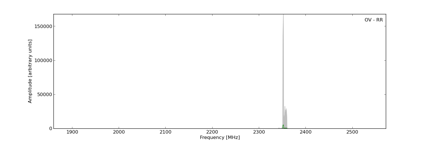 Total power spectrum in arbitrary units. The solid lines indicate the mean value and the shaded area the peaks.
