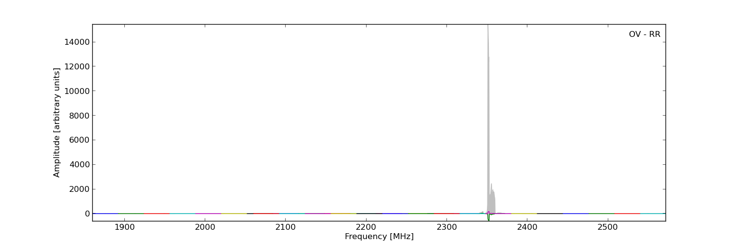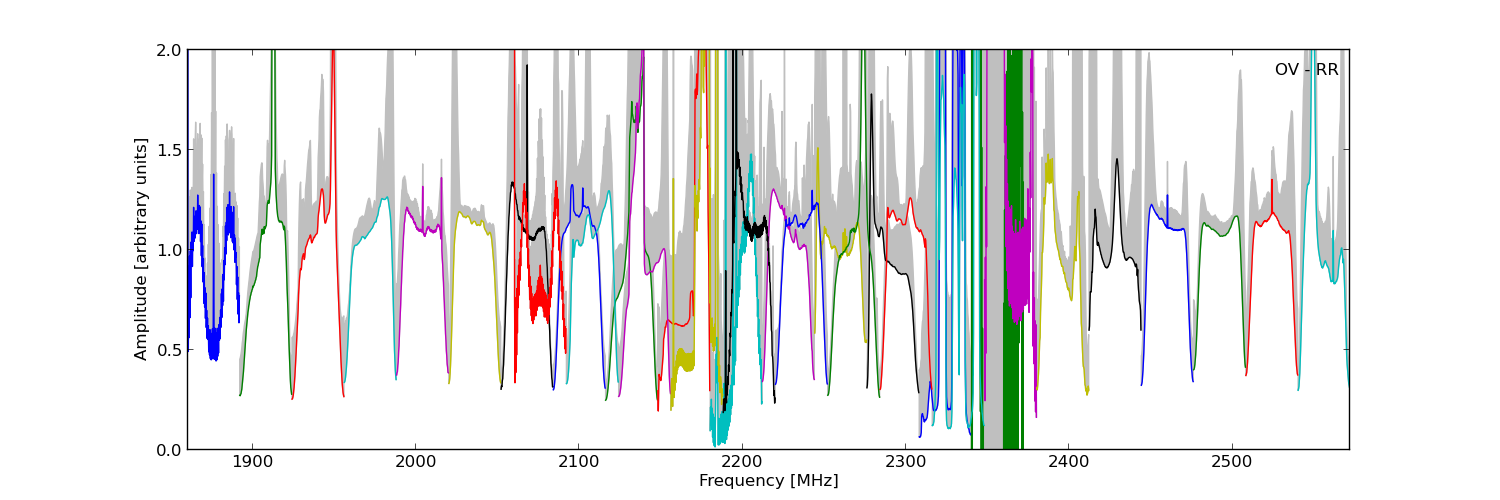 Total power spectrum in arbitrary units. The solid lines indicate the mean value and the shaded area the peaks.