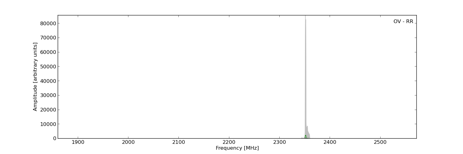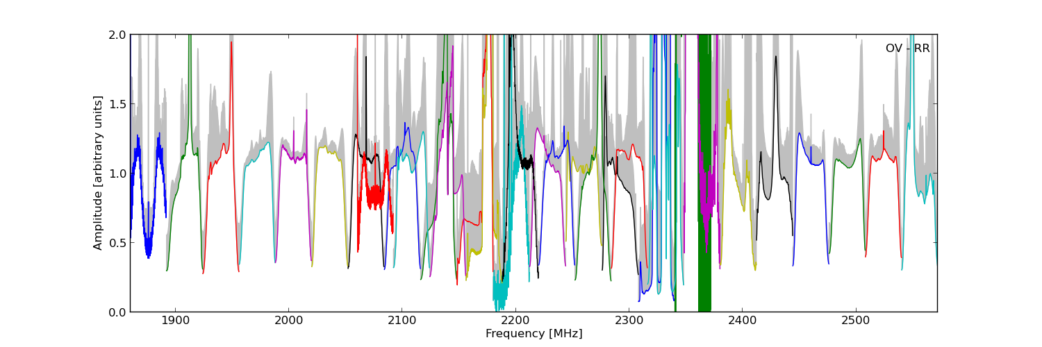 Total power spectrum in arbitrary units. The solid lines indicate the mean value and the shaded area the peaks.