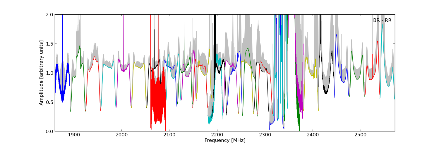 Total power spectrum in arbitrary units. The solid lines indicate the mean value and the shaded area the peaks.
