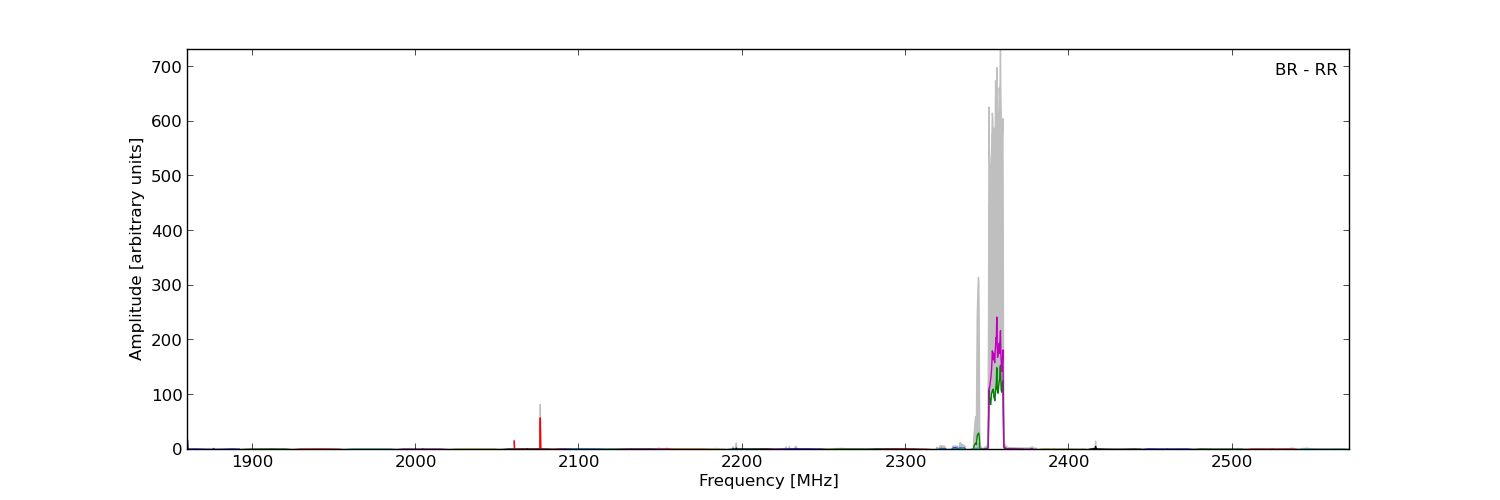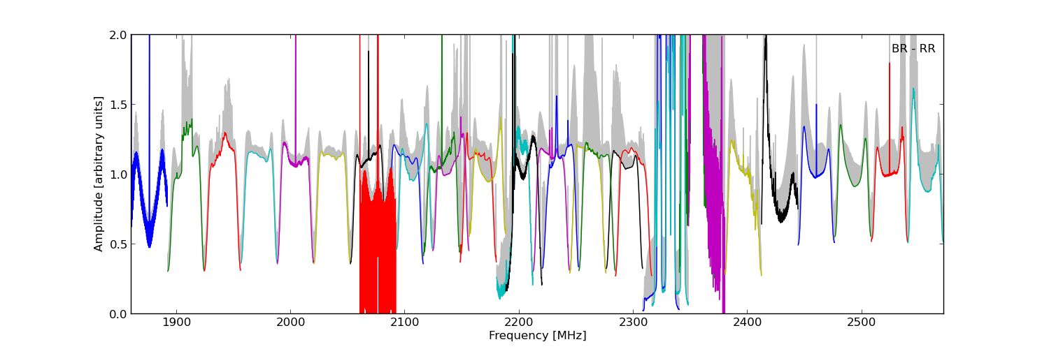 Total power spectrum in arbitrary units. The solid lines indicate the mean value and the shaded area the peaks.