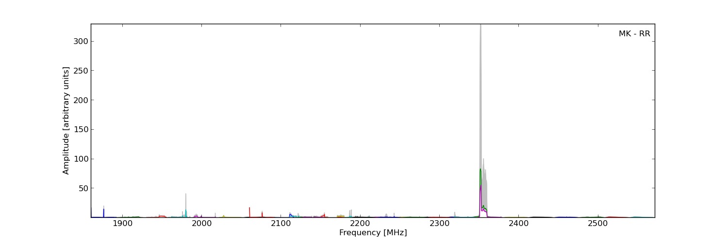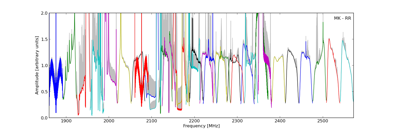 Total power spectrum in arbitrary units. The solid lines indicate the mean value and the shaded area the peaks.