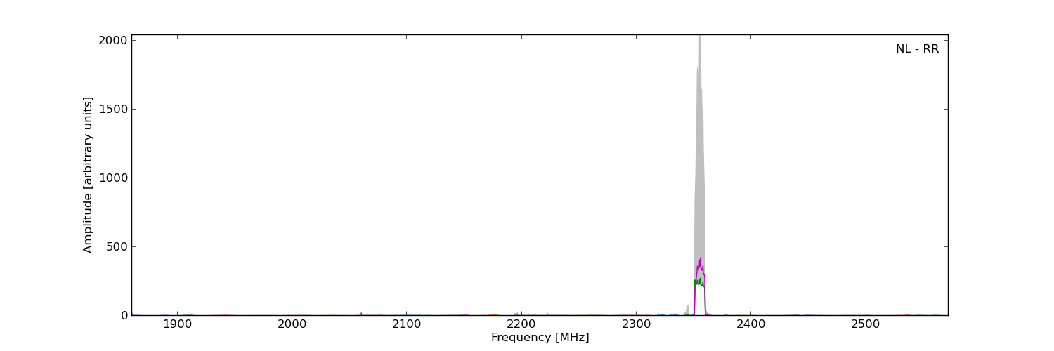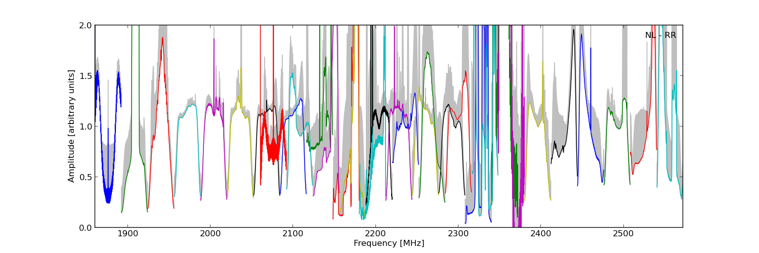 Total power spectrum in arbitrary units. The solid lines indicate the mean value and the shaded area the peaks.