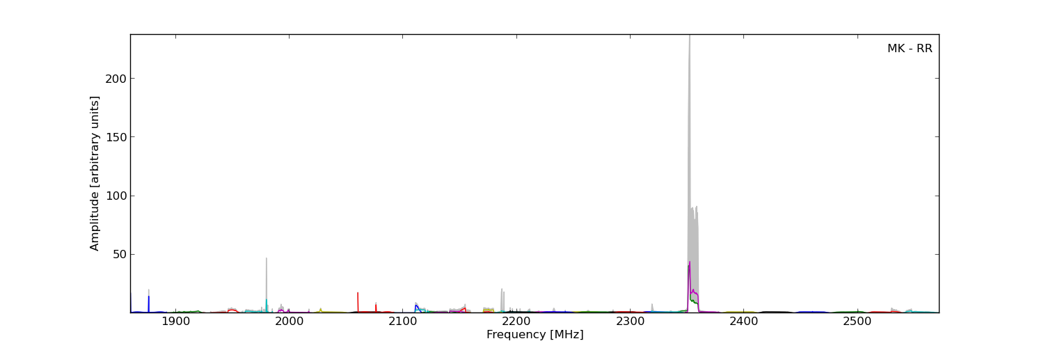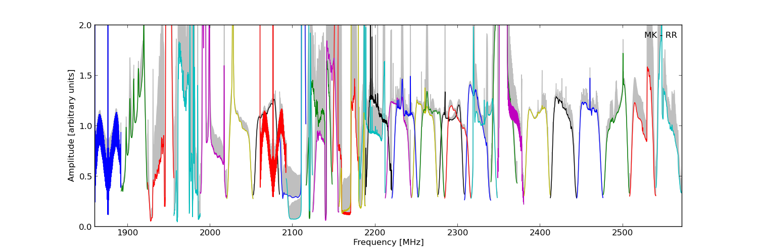 Total power spectrum in arbitrary units. The solid lines indicate the mean value and the shaded area the peaks.