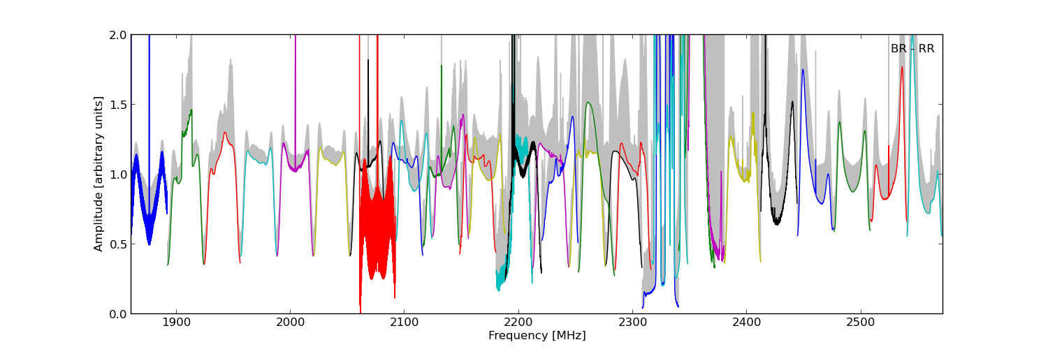 Total power spectrum in arbitrary units. The solid lines indicate the mean value and the shaded area the peaks.