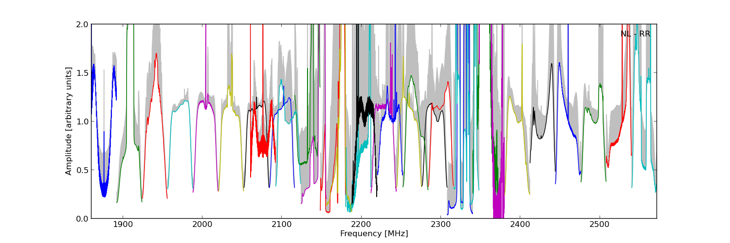 Total power spectrum in arbitrary units. The solid lines indicate the mean value and the shaded area the peaks.
