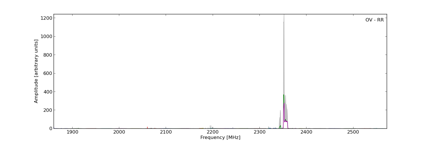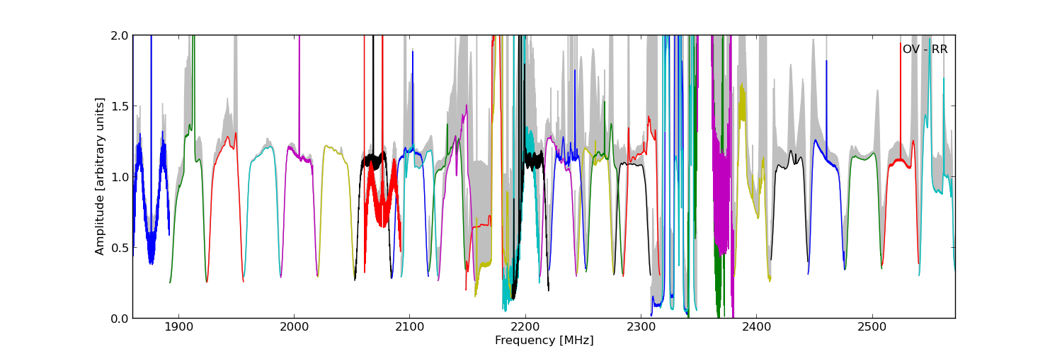 Total power spectrum in arbitrary units. The solid lines indicate the mean value and the shaded area the peaks.