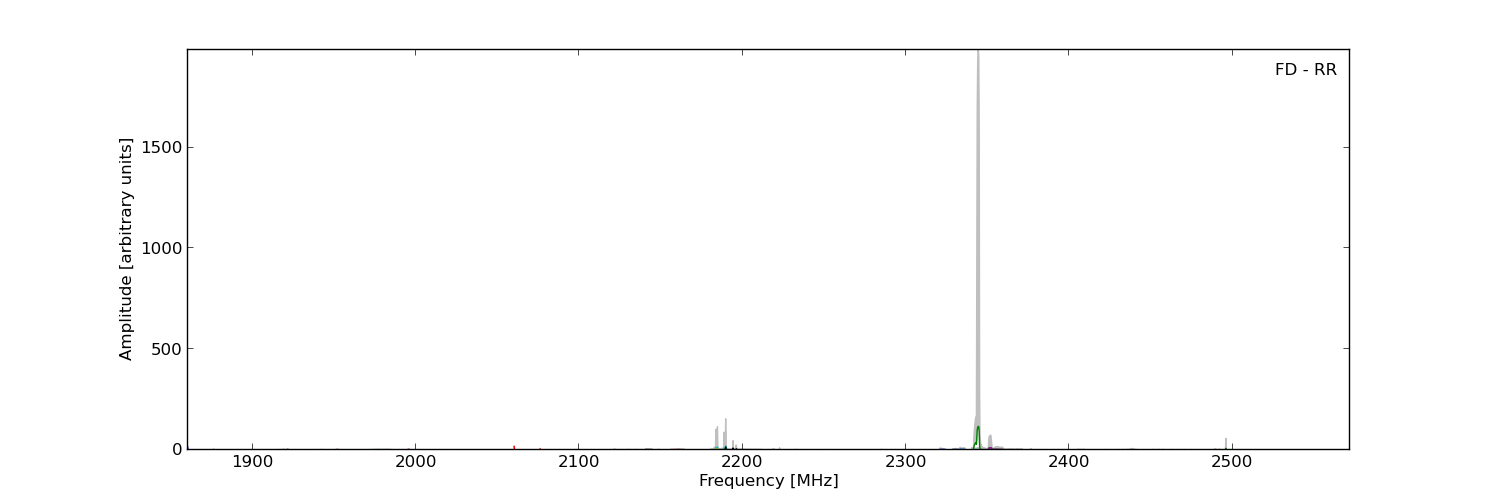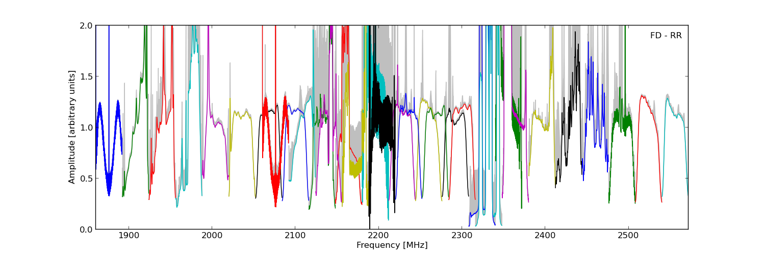Total power spectrum in arbitrary units. The solid lines indicate the mean value and the shaded area the peaks.