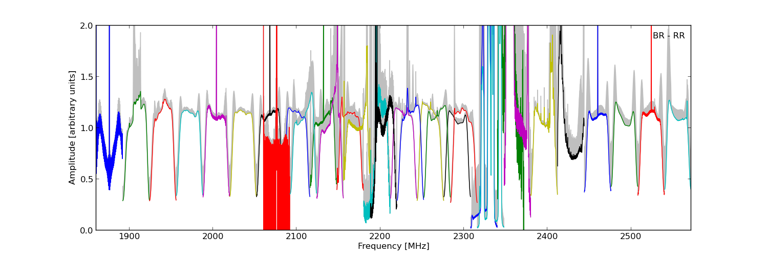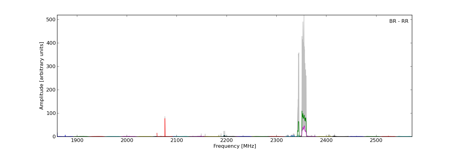 Total power spectrum in arbitrary units. The solid lines indicate the mean value and the shaded area the peaks.