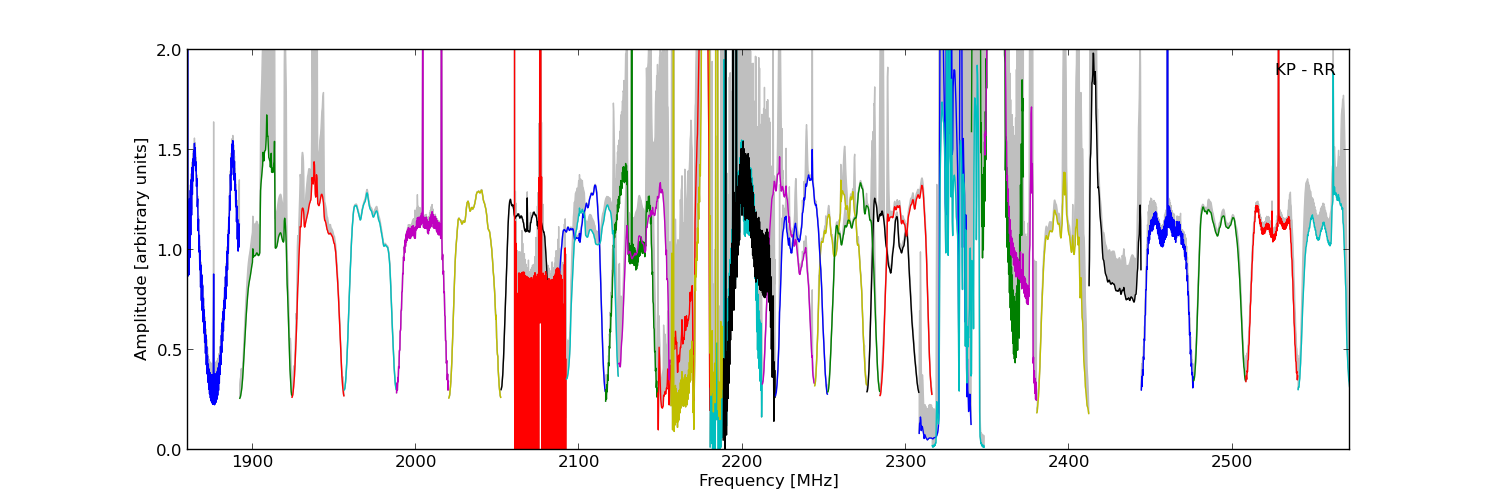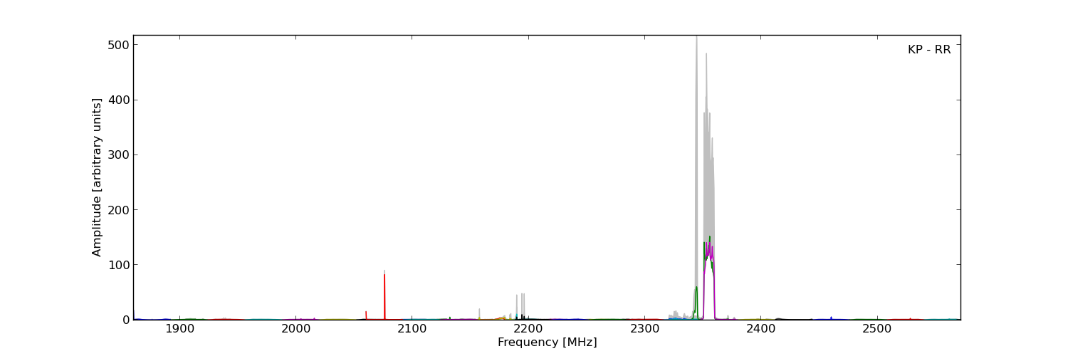 Total power spectrum in arbitrary units. The solid lines indicate the mean value and the shaded area the peaks.