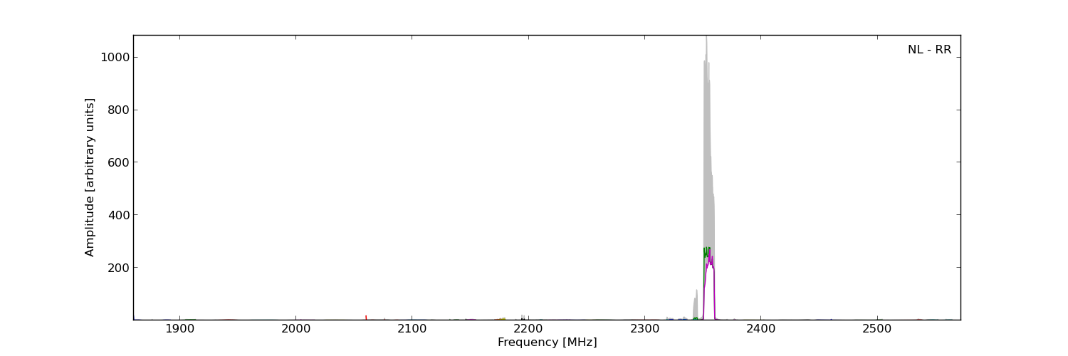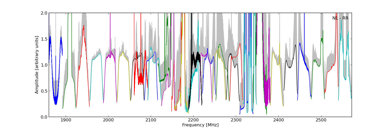 Total power spectrum in arbitrary units. The solid lines indicate the mean value and the shaded area the peaks.