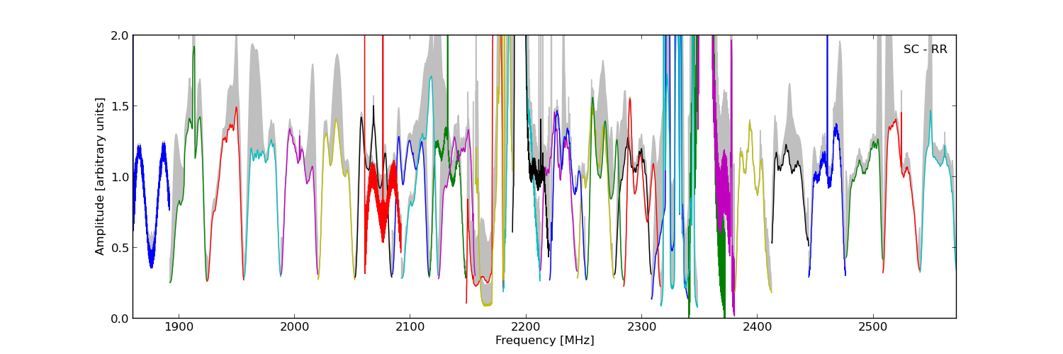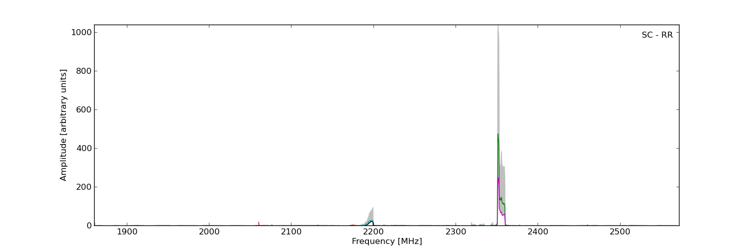 Total power spectrum in arbitrary units. The solid lines indicate the mean value and the shaded area the peaks.