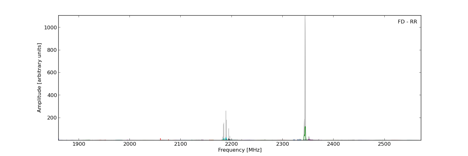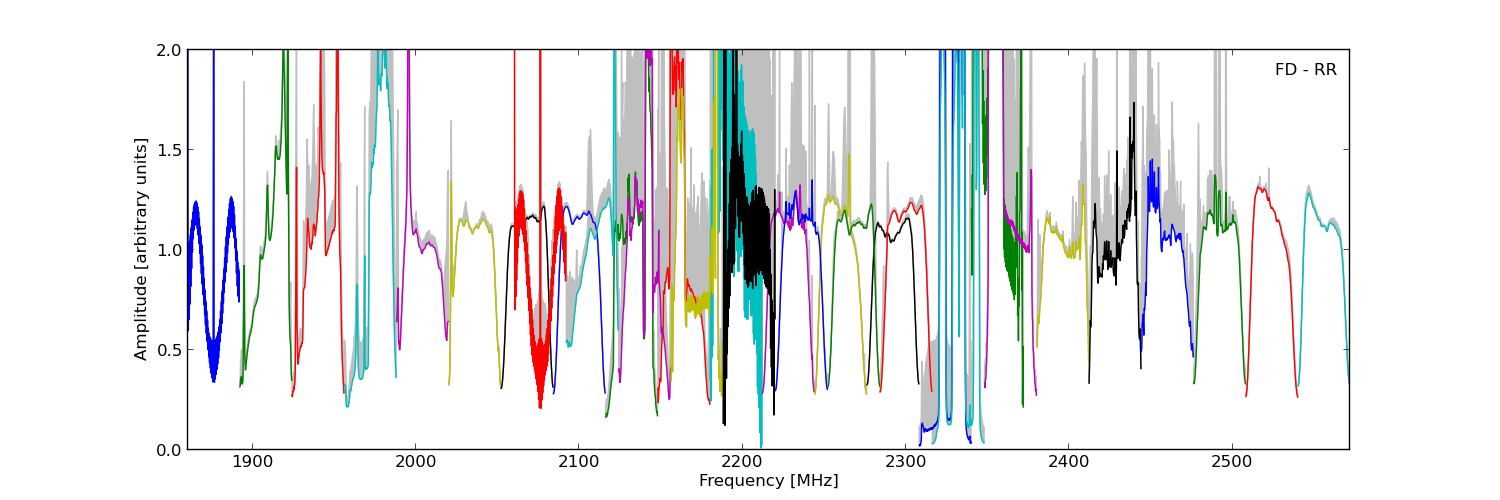 Total power spectrum in arbitrary units. The solid lines indicate the mean value and the shaded area the peaks.
