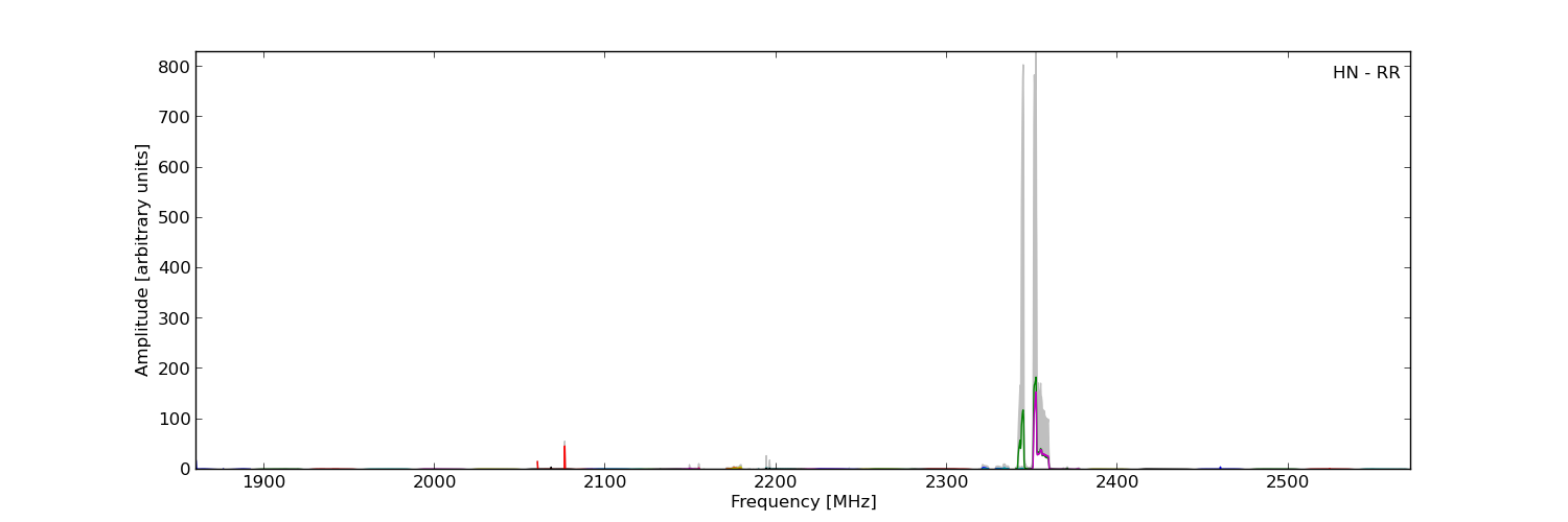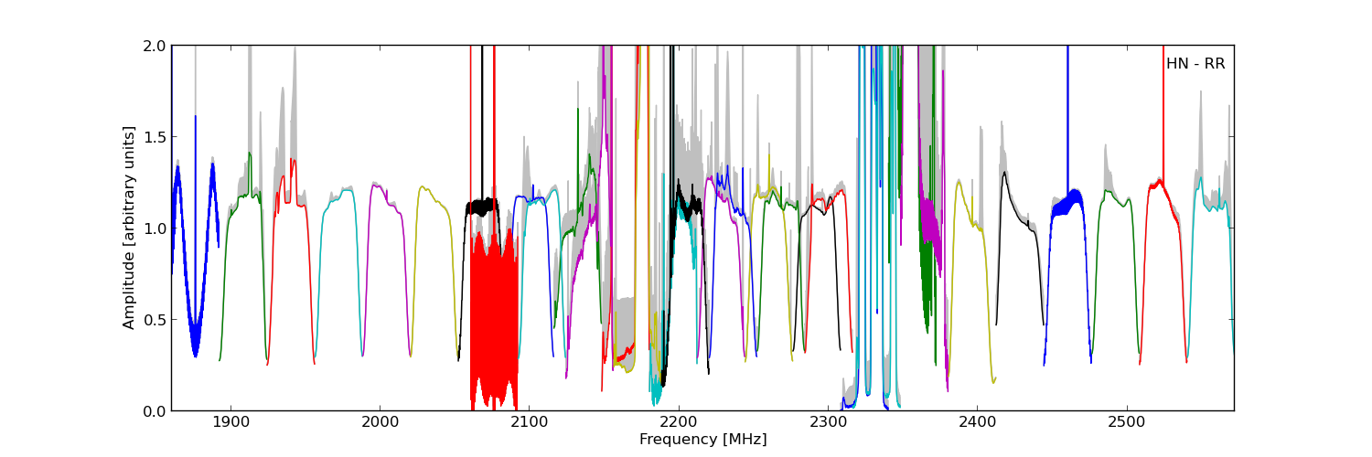 Total power spectrum in arbitrary units. The solid lines indicate the mean value and the shaded area the peaks.