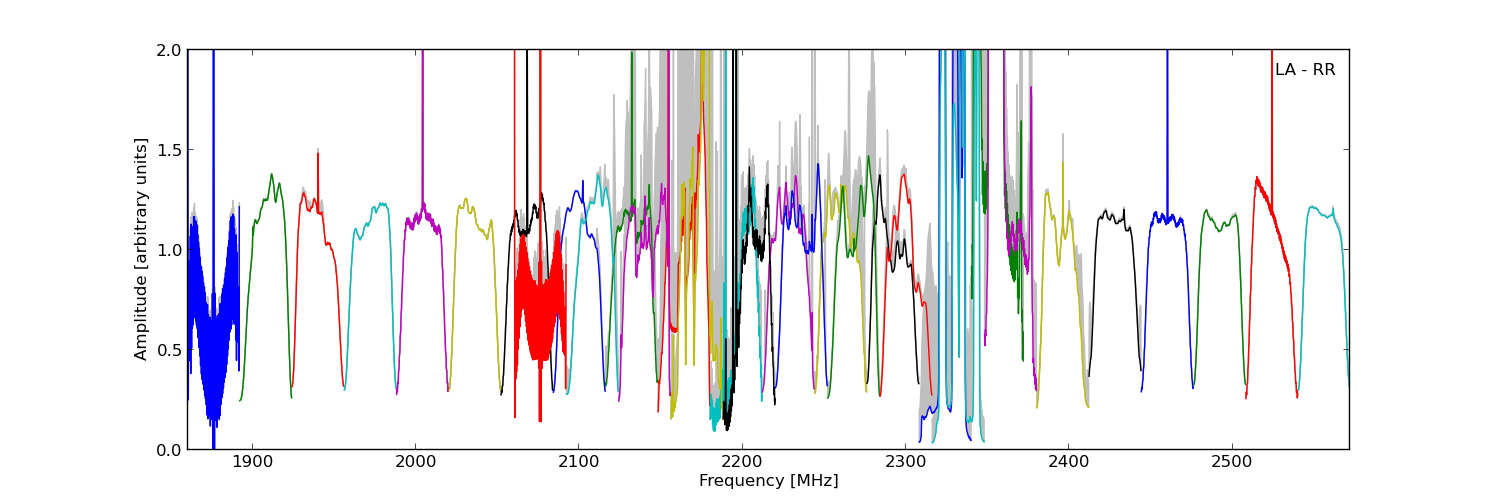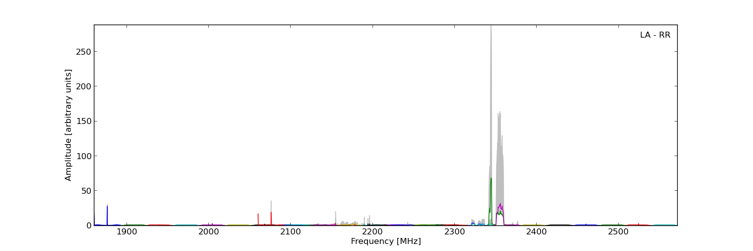 Total power spectrum in arbitrary units. The solid lines indicate the mean value and the shaded area the peaks.