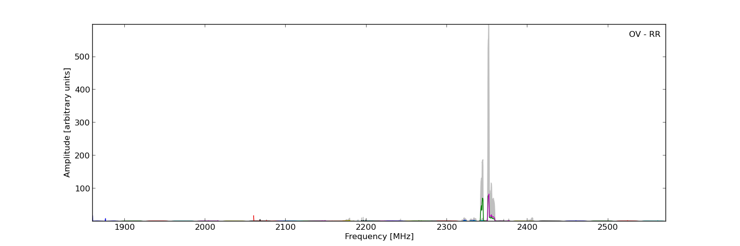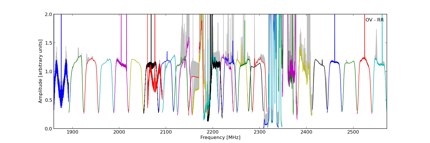 Total power spectrum in arbitrary units. The solid lines indicate the mean value and the shaded area the peaks.