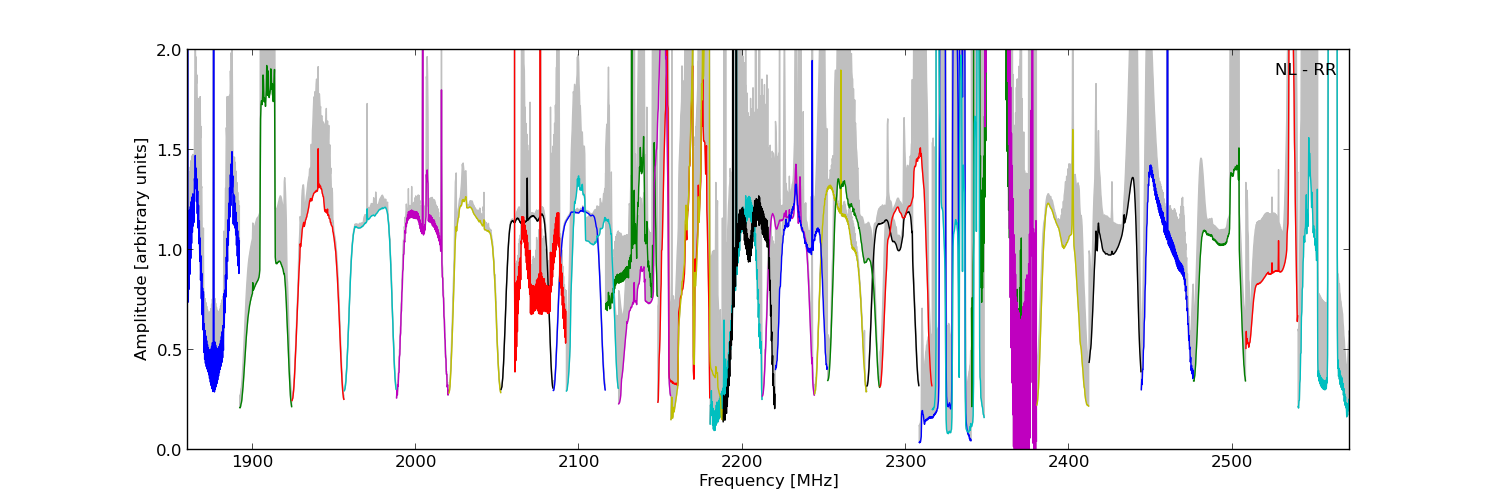 Total power spectrum in arbitrary units. The solid lines indicate the mean value and the shaded area the peaks.