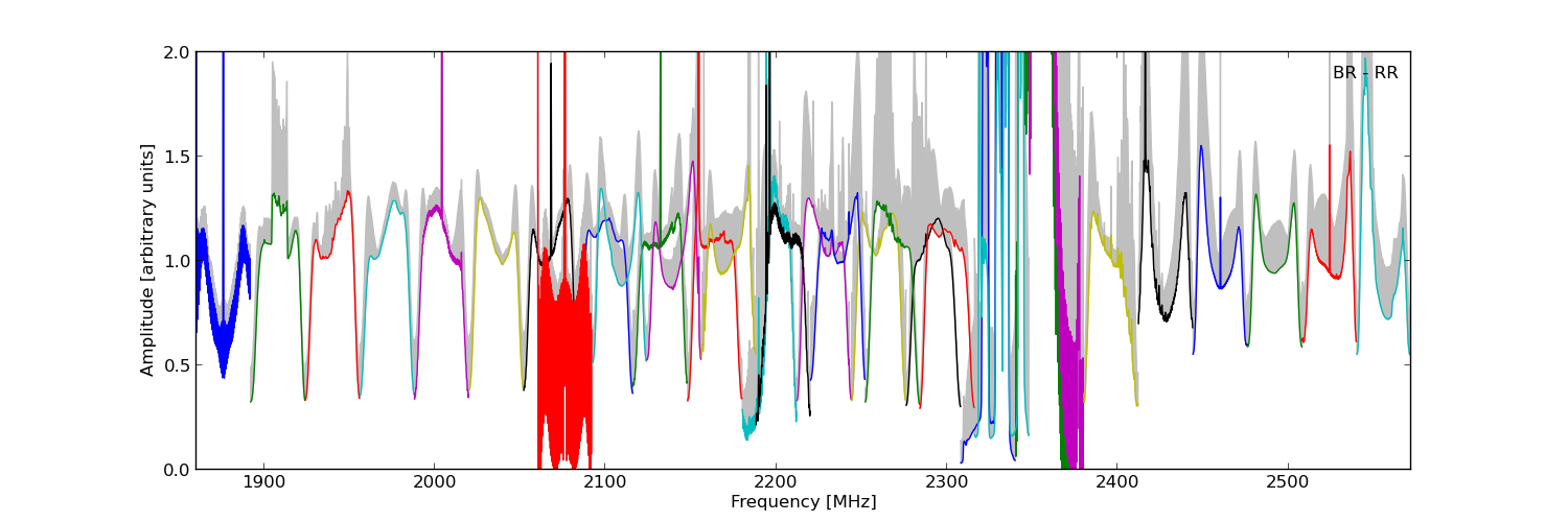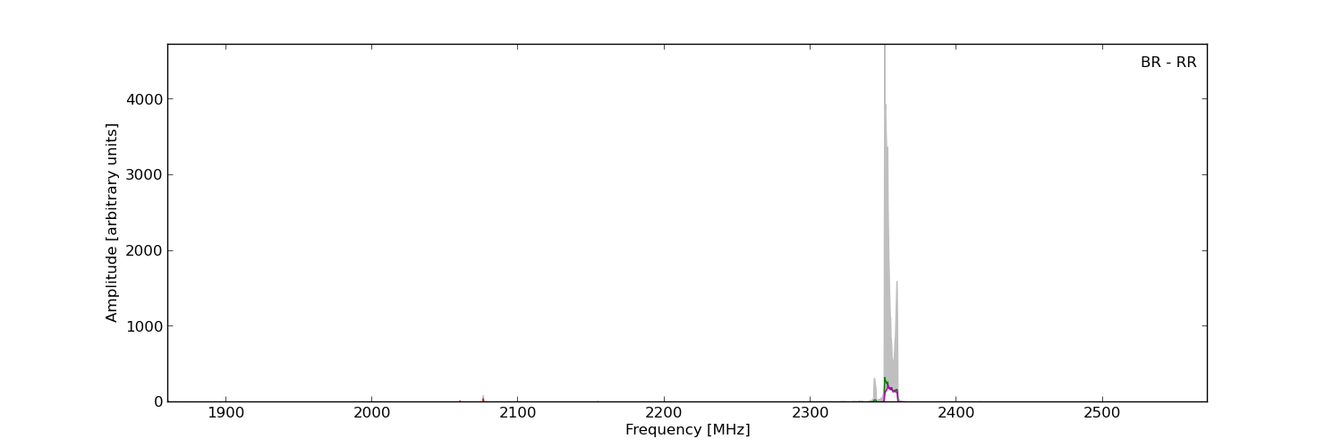 Total power spectrum in arbitrary units. The solid lines indicate the mean value and the shaded area the peaks.