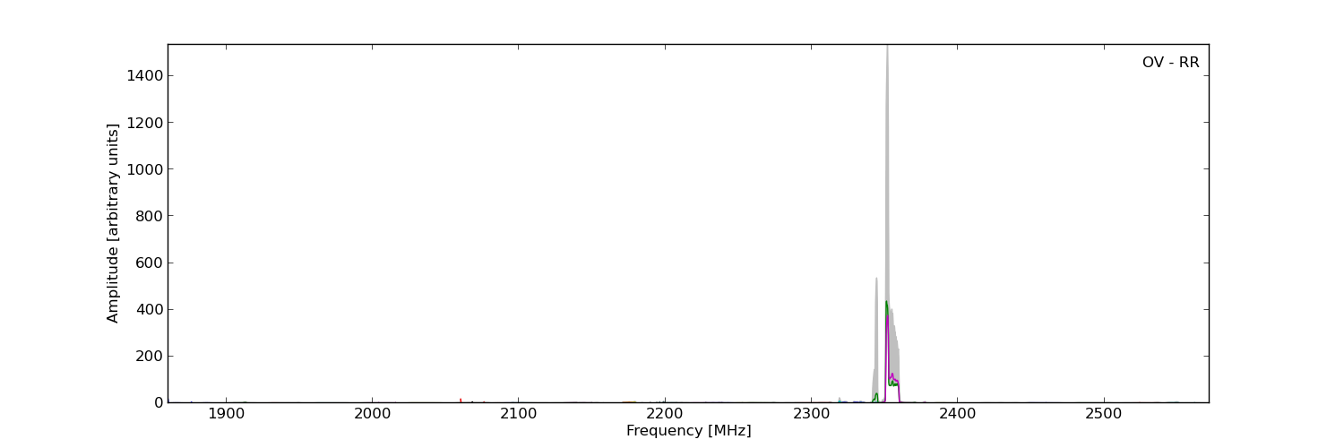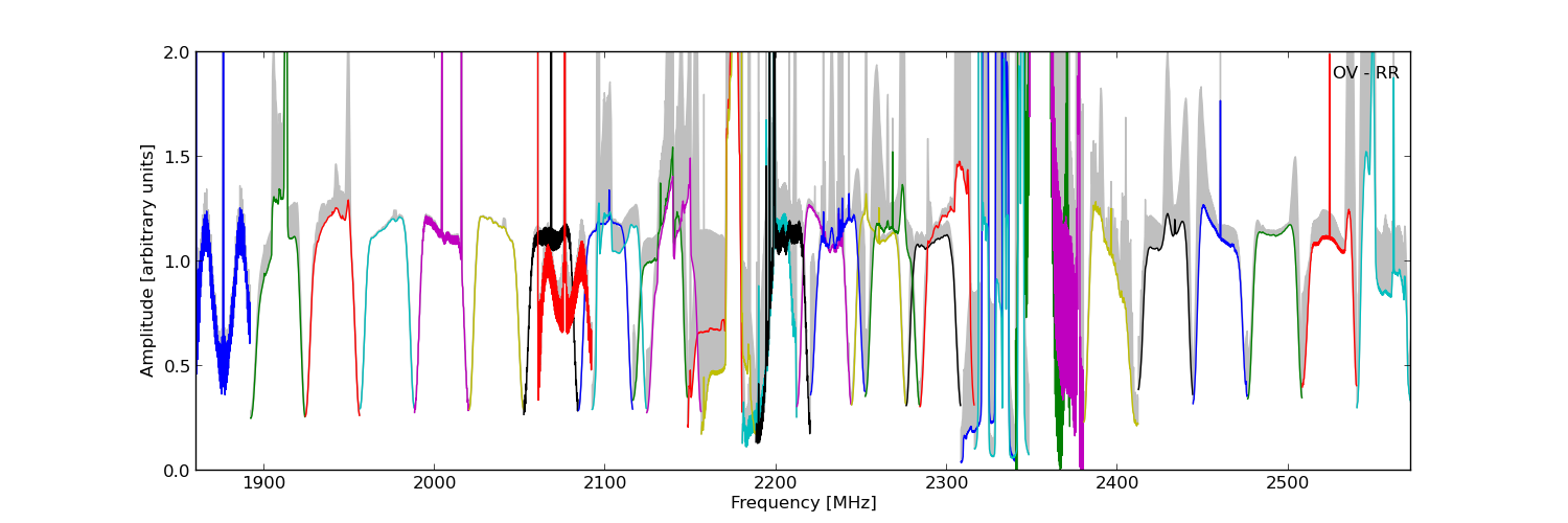 Total power spectrum in arbitrary units. The solid lines indicate the mean value and the shaded area the peaks.