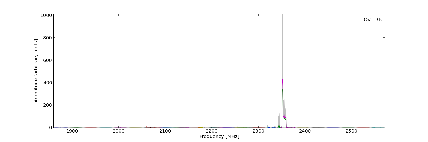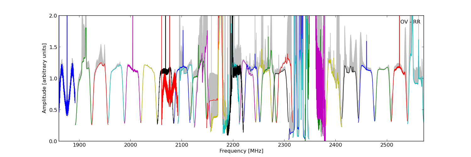Total power spectrum in arbitrary units. The solid lines indicate the mean value and the shaded area the peaks.