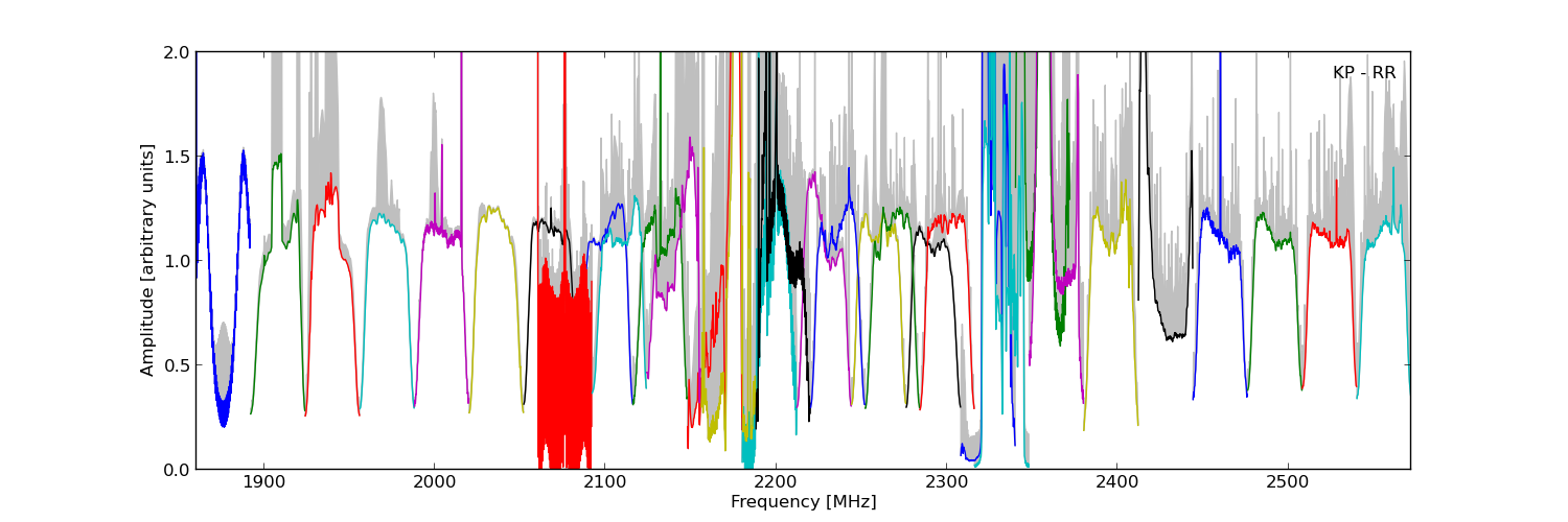 Total power spectrum in arbitrary units. The solid lines indicate the mean value and the shaded area the peaks.