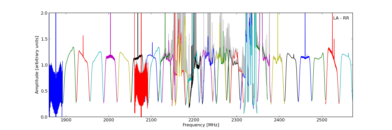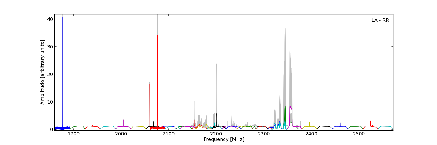 Total power spectrum in arbitrary units. The solid lines indicate the mean value and the shaded area the peaks.
