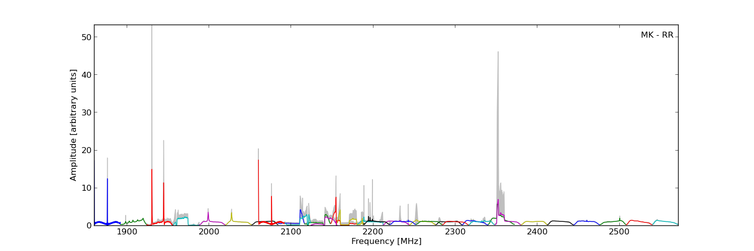 Total power spectrum in arbitrary units. The solid lines indicate the mean value and the shaded area the peaks.