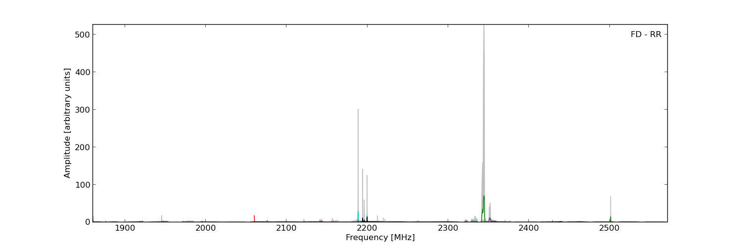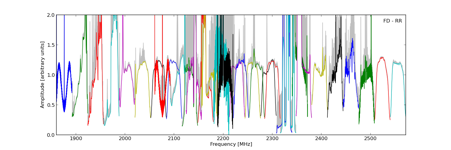 Total power spectrum in arbitrary units. The solid lines indicate the mean value and the shaded area the peaks.