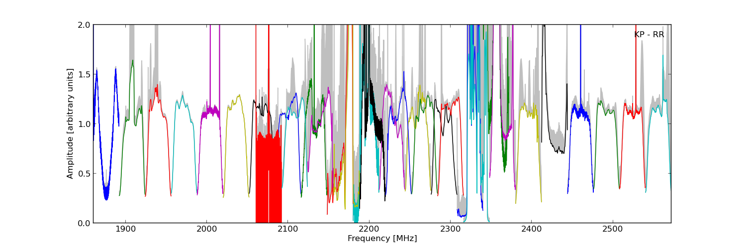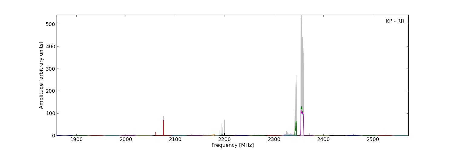 Total power spectrum in arbitrary units. The solid lines indicate the mean value and the shaded area the peaks.