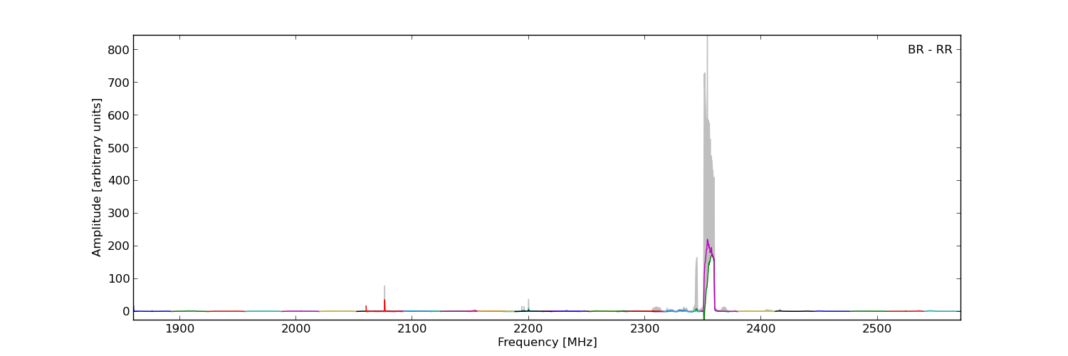 Total power spectrum in arbitrary units. The solid lines indicate the mean value and the shaded area the peaks.