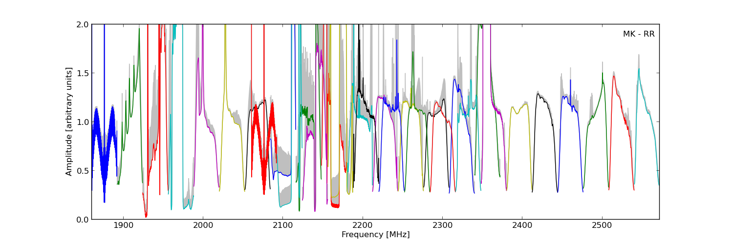 Total power spectrum in arbitrary units. The solid lines indicate the mean value and the shaded area the peaks.