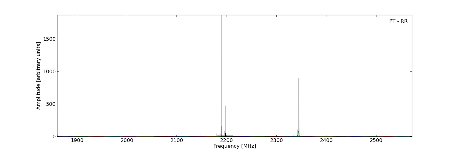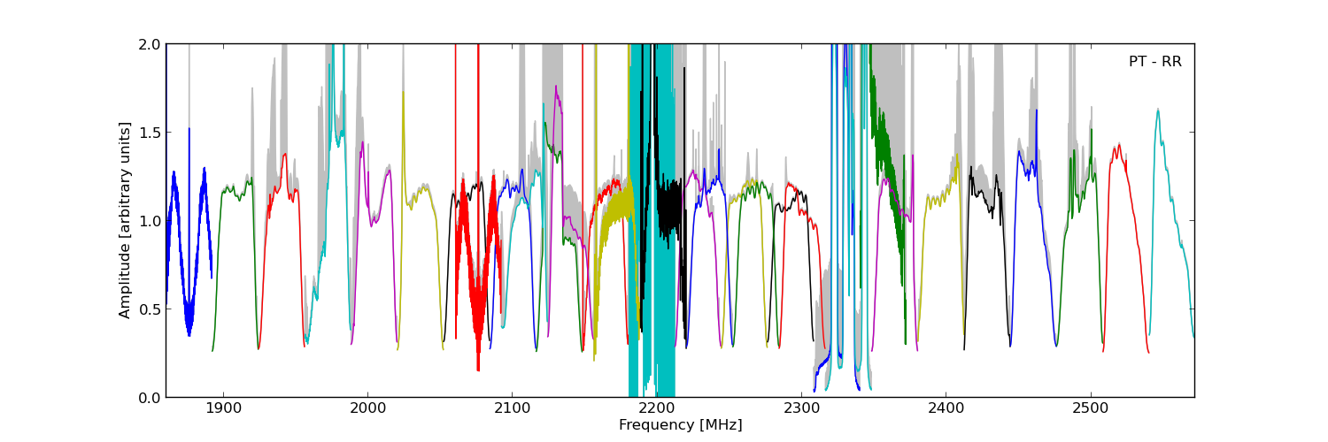 Total power spectrum in arbitrary units. The solid lines indicate the mean value and the shaded area the peaks.