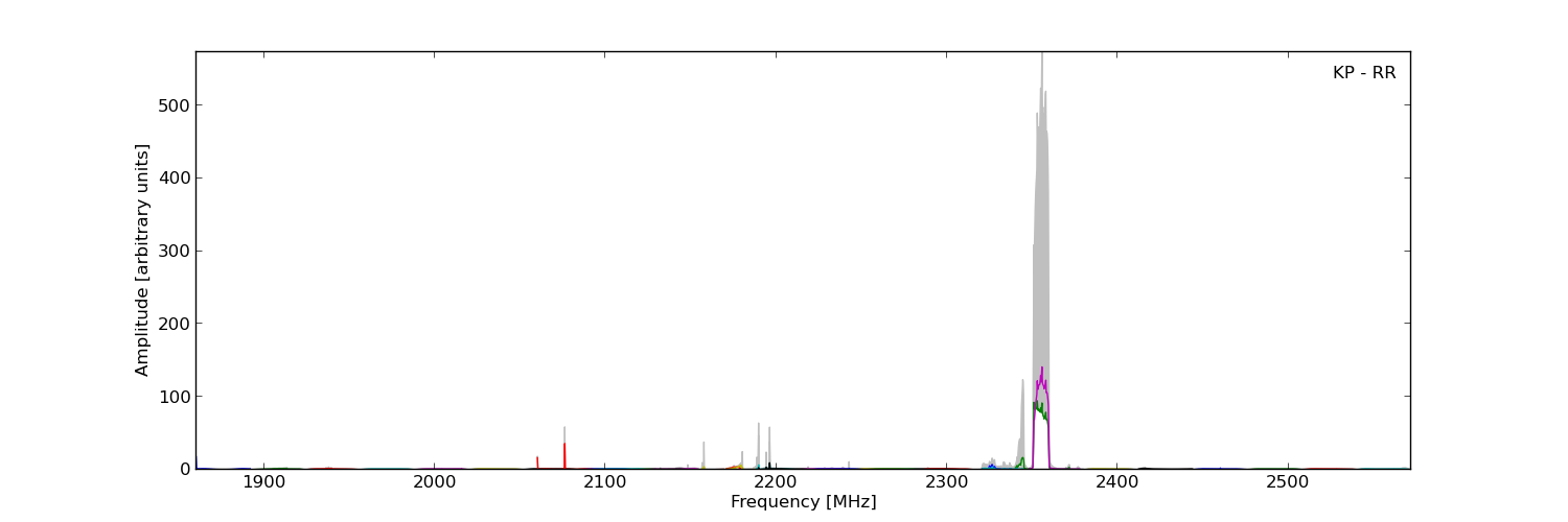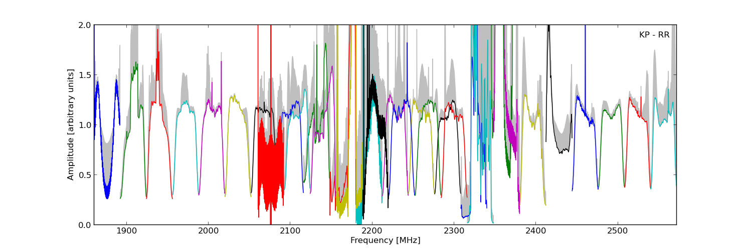 Total power spectrum in arbitrary units. The solid lines indicate the mean value and the shaded area the peaks.