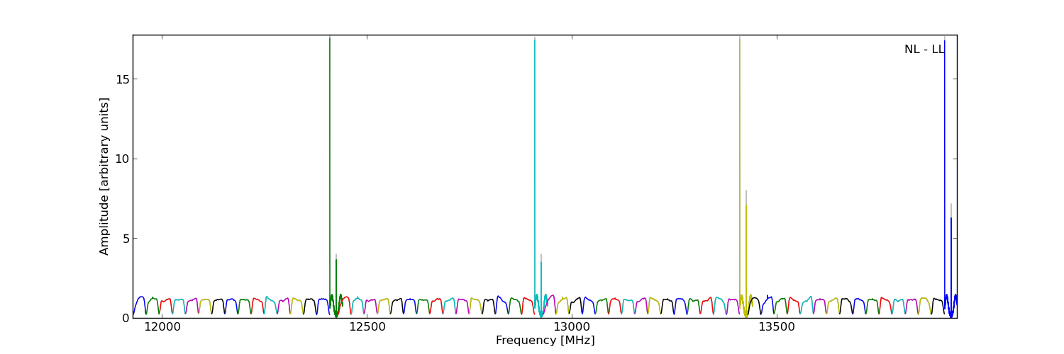 Total power spectrum in arbitrary units. The solid lines indicate the mean value and the shaded area the peaks.