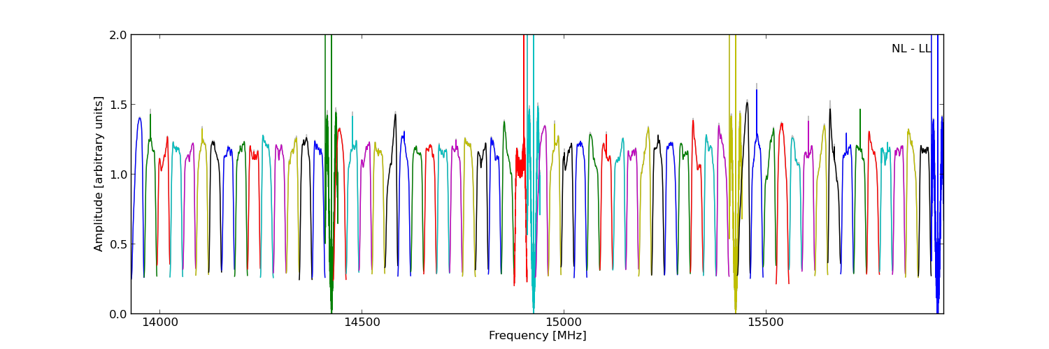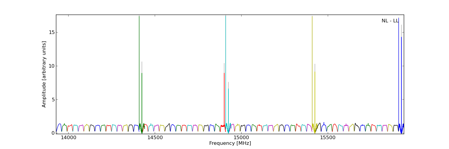 Total power spectrum in arbitrary units. The solid lines indicate the mean value and the shaded area the peaks.