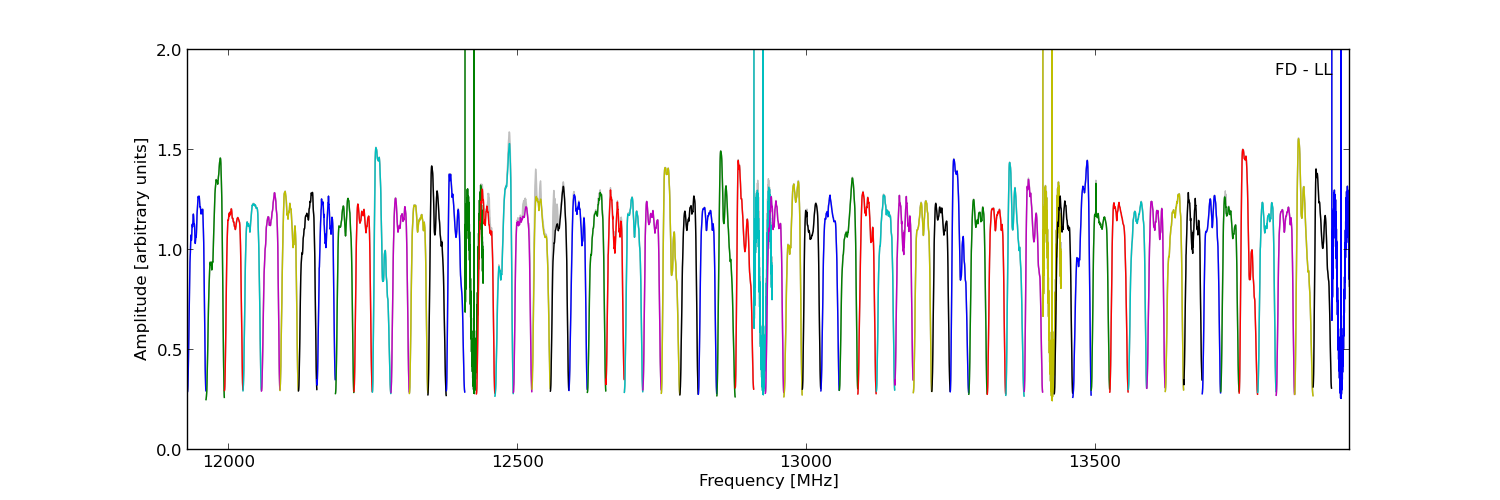 Total power spectrum in arbitrary units. The solid lines indicate the mean value and the shaded area the peaks.