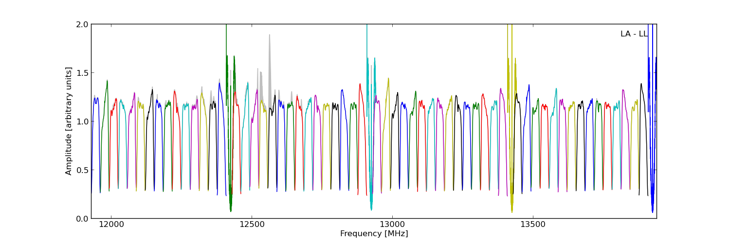 Total power spectrum in arbitrary units. The solid lines indicate the mean value and the shaded area the peaks.