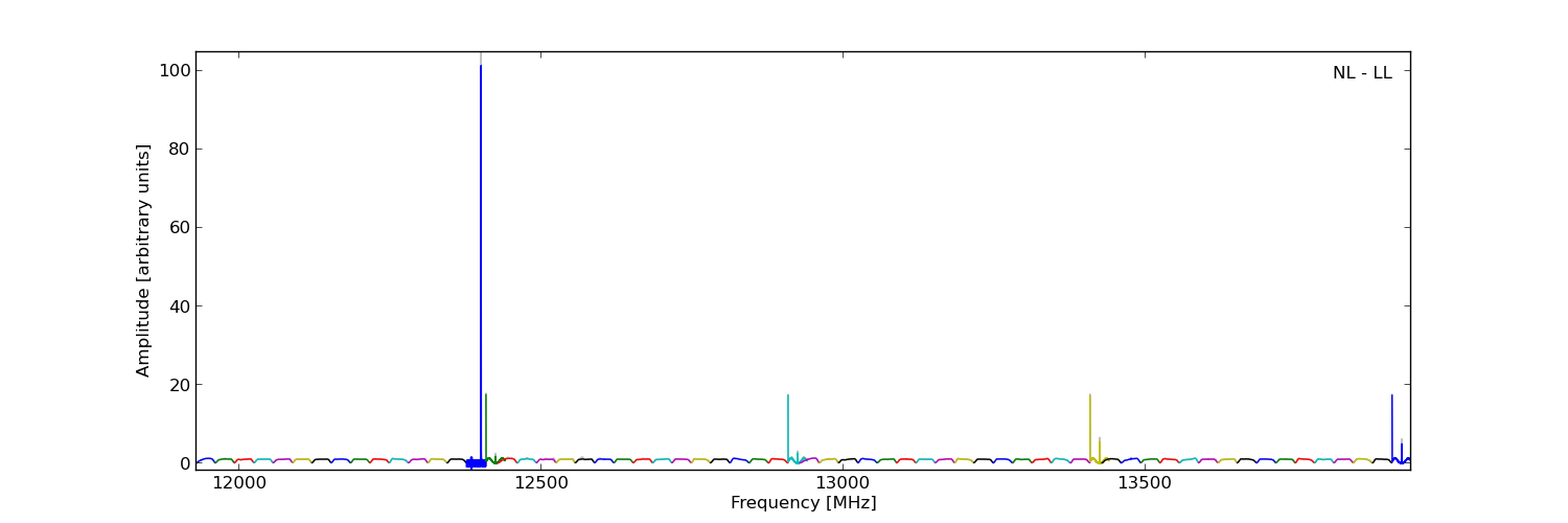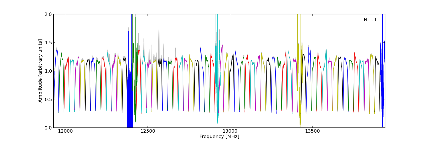 Total power spectrum in arbitrary units. The solid lines indicate the mean value and the shaded area the peaks.
