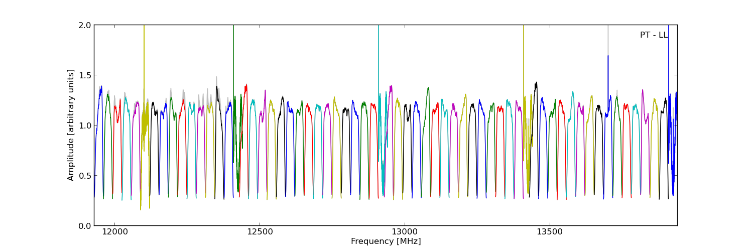 Total power spectrum in arbitrary units. The solid lines indicate the mean value and the shaded area the peaks.