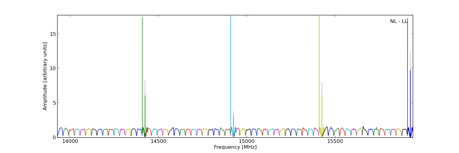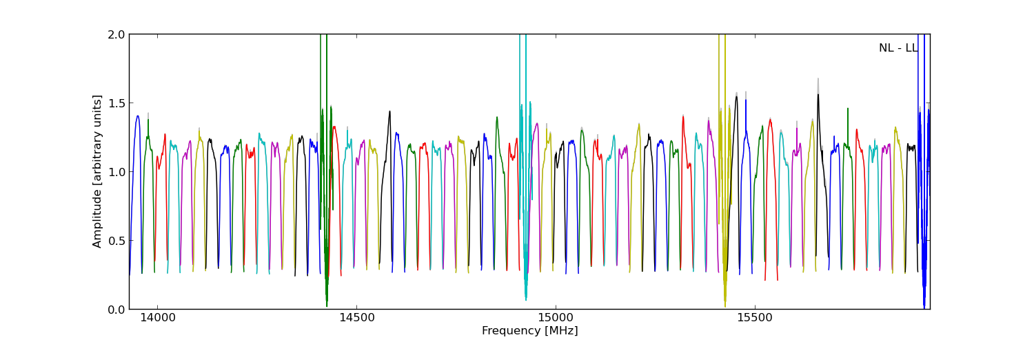 Total power spectrum in arbitrary units. The solid lines indicate the mean value and the shaded area the peaks.