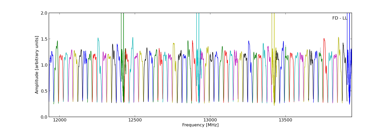 Total power spectrum in arbitrary units. The solid lines indicate the mean value and the shaded area the peaks.
