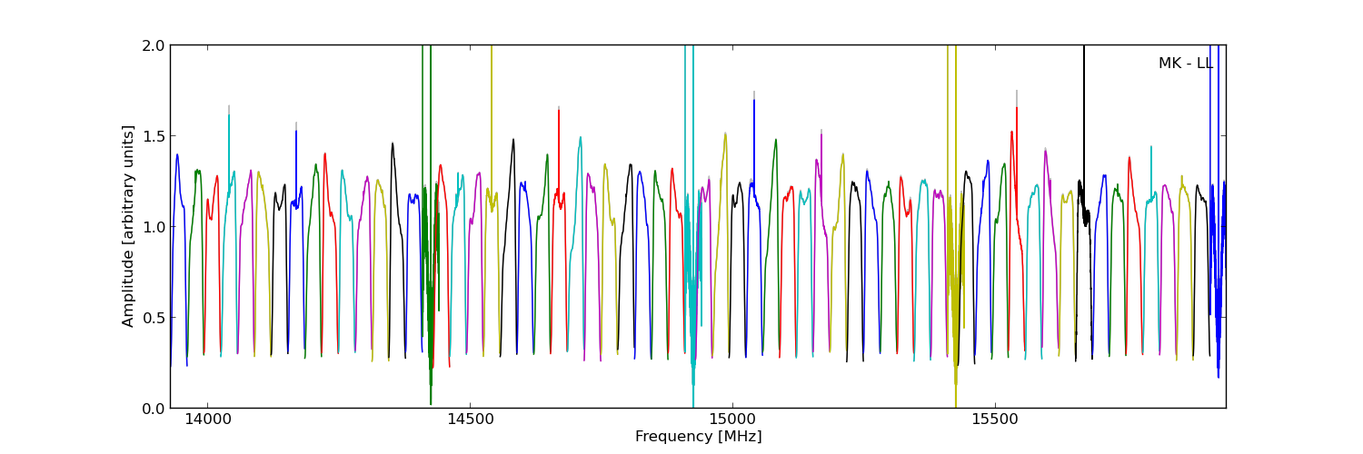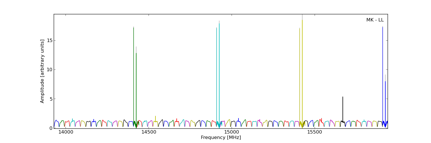 Total power spectrum in arbitrary units. The solid lines indicate the mean value and the shaded area the peaks.