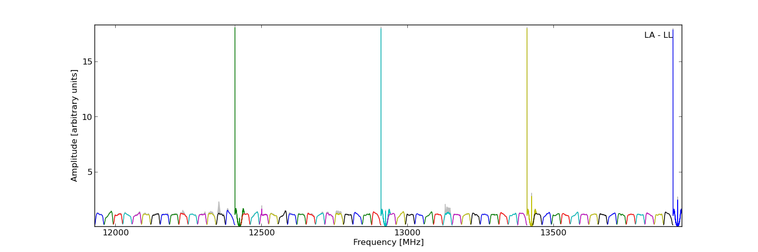 Total power spectrum in arbitrary units. The solid lines indicate the mean value and the shaded area the peaks.