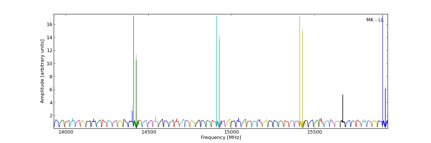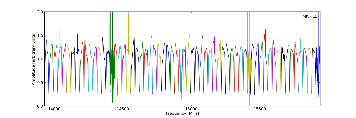 Total power spectrum in arbitrary units. The solid lines indicate the mean value and the shaded area the peaks.