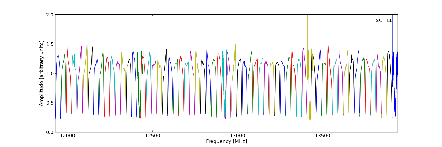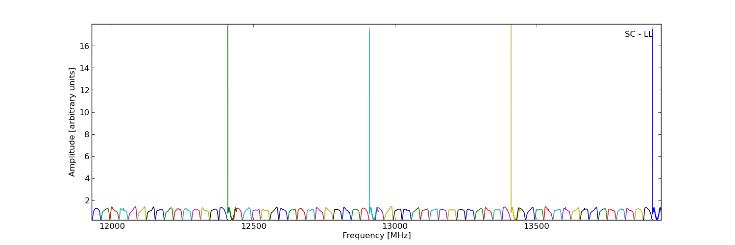 Total power spectrum in arbitrary units. The solid lines indicate the mean value and the shaded area the peaks.