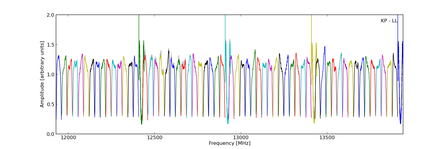 Total power spectrum in arbitrary units. The solid lines indicate the mean value and the shaded area the peaks.