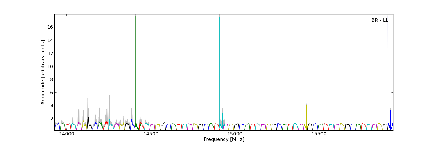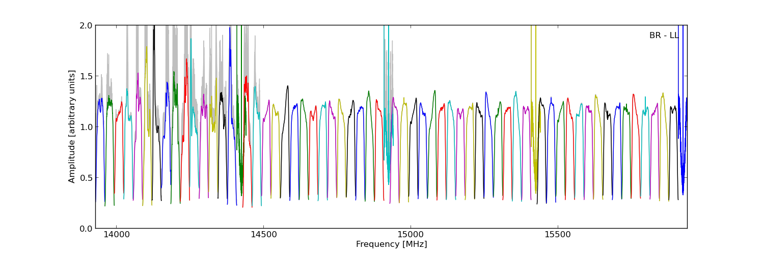 Total power spectrum in arbitrary units. The solid lines indicate the mean value and the shaded area the peaks.