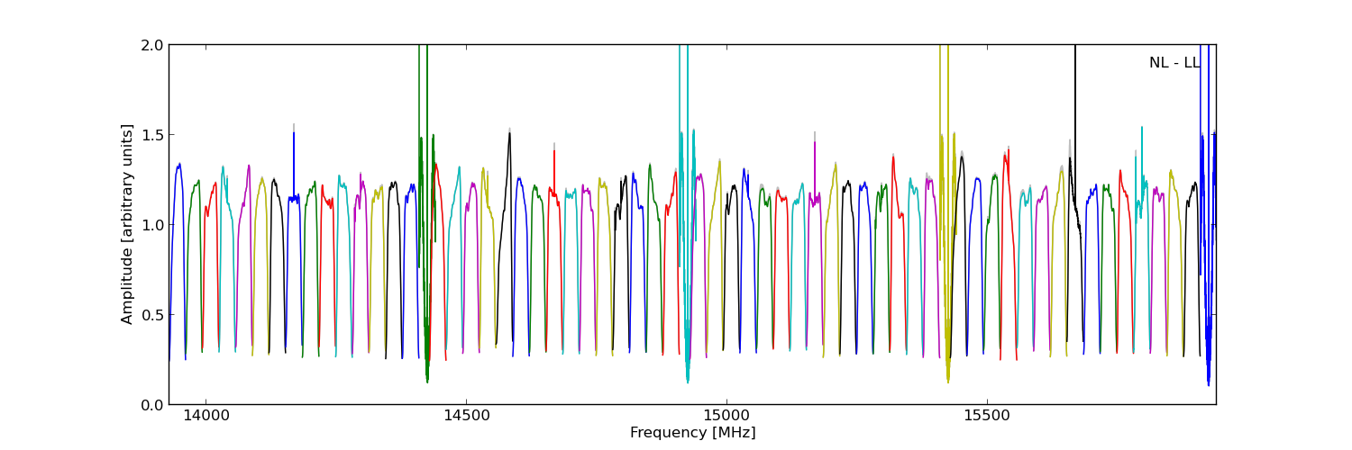Total power spectrum in arbitrary units. The solid lines indicate the mean value and the shaded area the peaks.